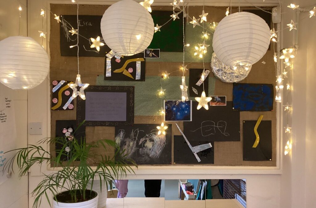 Class 1 children have drawn the moon, stars and planets, as well as rockets and astronauts, using different mediums such as chalk and paint for two-dimensional pictures and junk modelling, string and tape for three-dimensional representations. This exploration across different materials and dimensions helps children understand how the same subject can be represented in various ways whilst developing their artistic techniques and spatial awareness. The children’s work has inspired a display where all their creations can be shared and enjoyed by everyone who comes into the classroom, creating a celebration of their creativity and a sense of pride in their achievements. Class 1 has gone a bit space-mad!